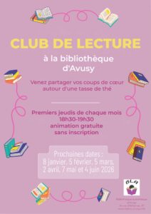 L’équipe de la bibliothèque-ludothèque d’Avusy a le plaisir de vous annoncer la reprise du club de lecture tous les premiers jeudis de chaque mois.